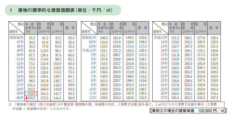 新しく同じ建物を立てると仮定したとき、床面積あたりいくらかかるのか、という指標です。